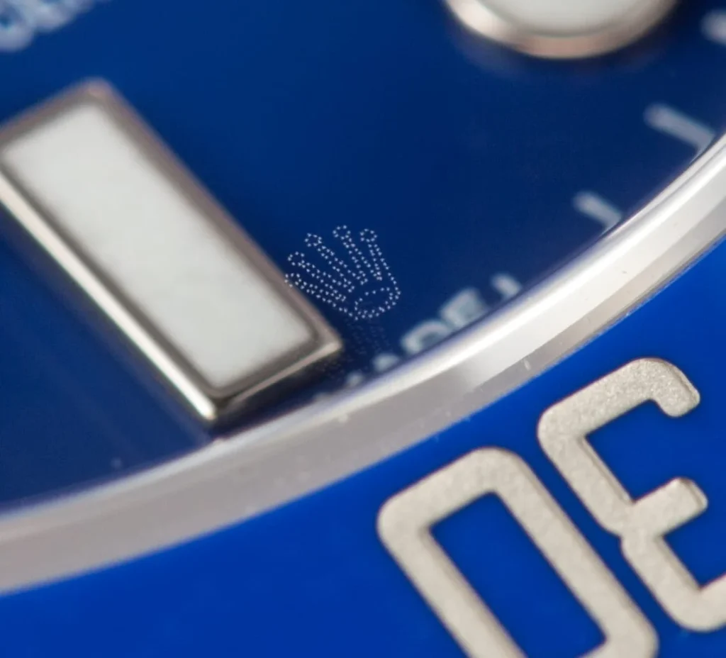 Since 2002, Rolex has added a hidden crown logo at the 6 oâclock position on the sapphire crystalâa nearly invisible detail unless viewed under magnification and at the right angle of light. In the fake Rolex vs real comparison, this micro-etched coronet is one of the brandâs most recognizable security marks.