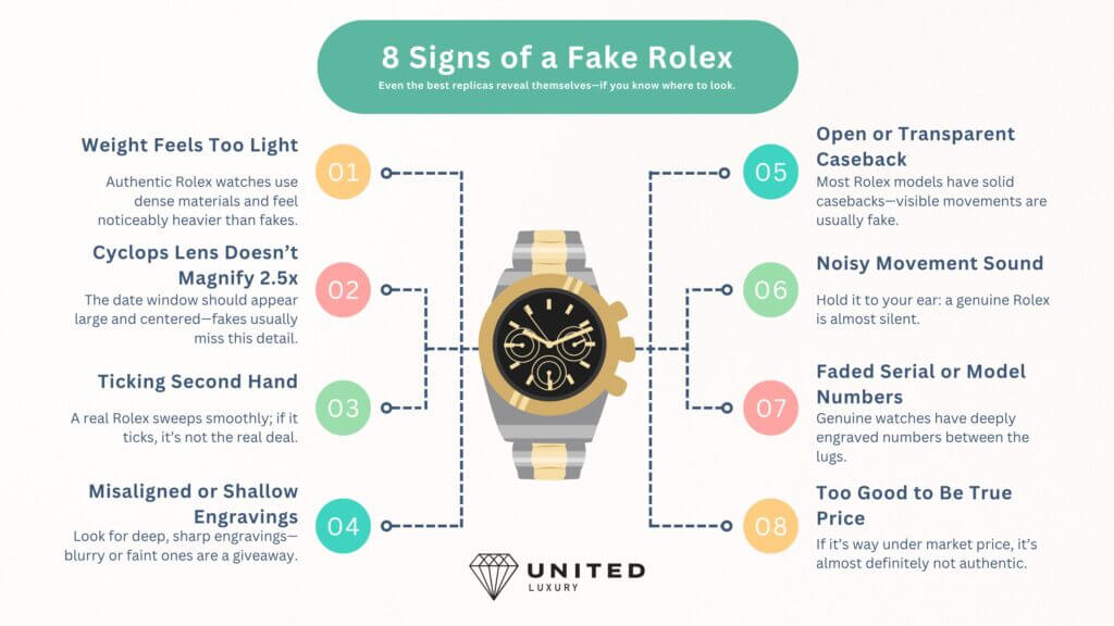 Cheap replicas often feel light and hollow, made from inferior alloys or plated metals. That lack of weight instantly signals a poor-quality fake.
