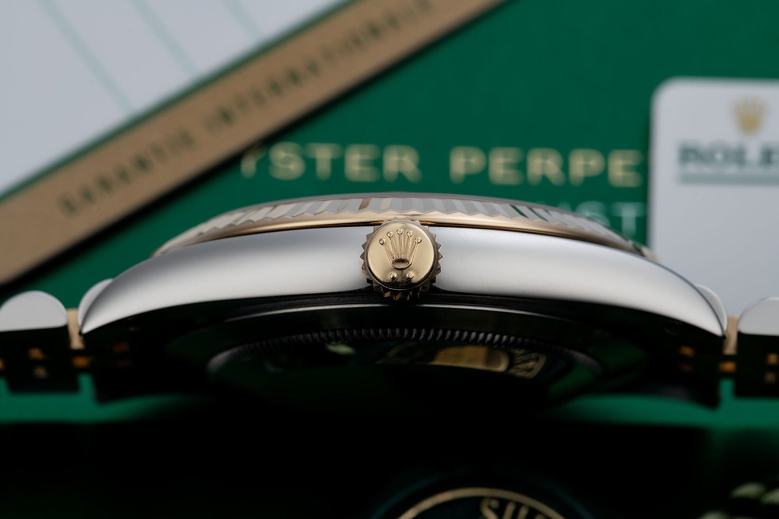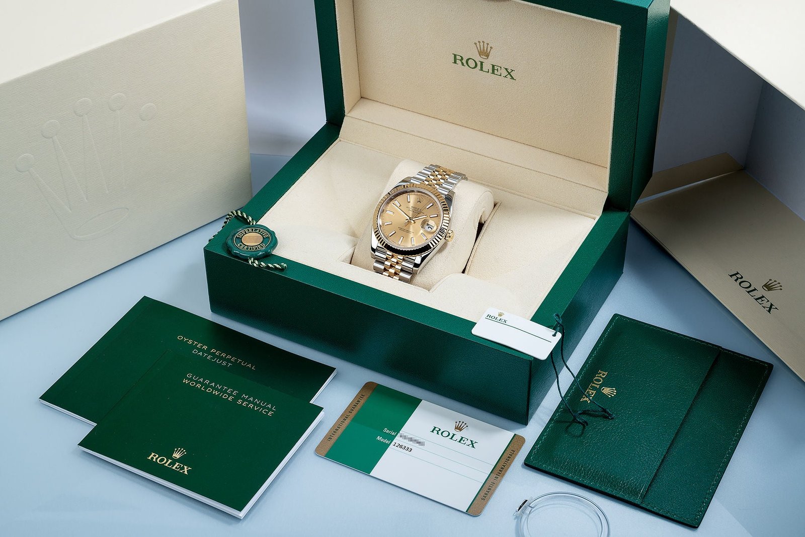 41mm Yellow Rolesor case with 904L steel monobloc middle case, screw-down steel back, 18K yellow gold screw-down crown, 18K yellow gold fluted bezel, scratch-resistant double anti-reflective sapphire crystal with cyclops lens over the date, champagne dial, index hour markers, Rolex caliber 3235 perpetual self-winding movement with date at 3 o’clock that changes instantaneously at midnight in a few thousandths of a second, approximately 70 hours of power reserve, yellow Rolesor Jubilee bracelet made from a combination of 904L steel and 18K yellow gold with five-piece links, folding Oysterclasp buckle with Easylink 5mm comfort extension link. Waterproof to 100 meters.