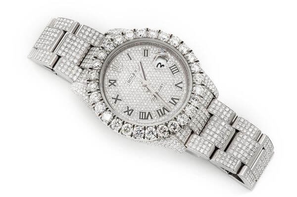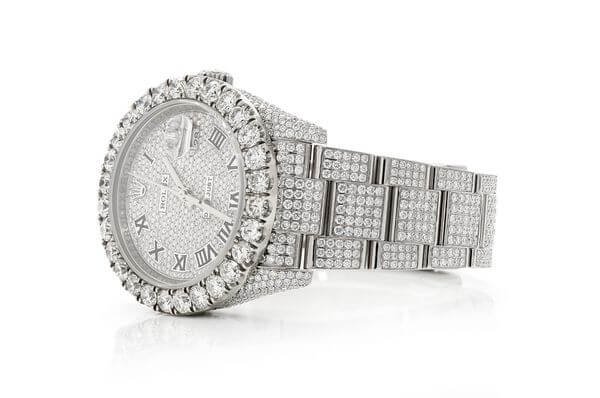 When it comes to affordable yet stylish accessories, cheap iced out watches offer a glamorous touch to any outfit. This Rolex Date Just is made of Rose and has a 36mm case size with 20.50ctw of Moissanite diamonds. Our expert watchmakers have serviced this watch inside and out to Rolex quality standards. This watch comes with an Rolex box.