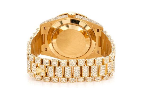 This Iced out watches Rolex Day-Date is made of Yellow Gold and 40mm with 20.30ctw of Moissanite diamonds. This watch is Rolex quality standards. This watch comes with an Rolex box.