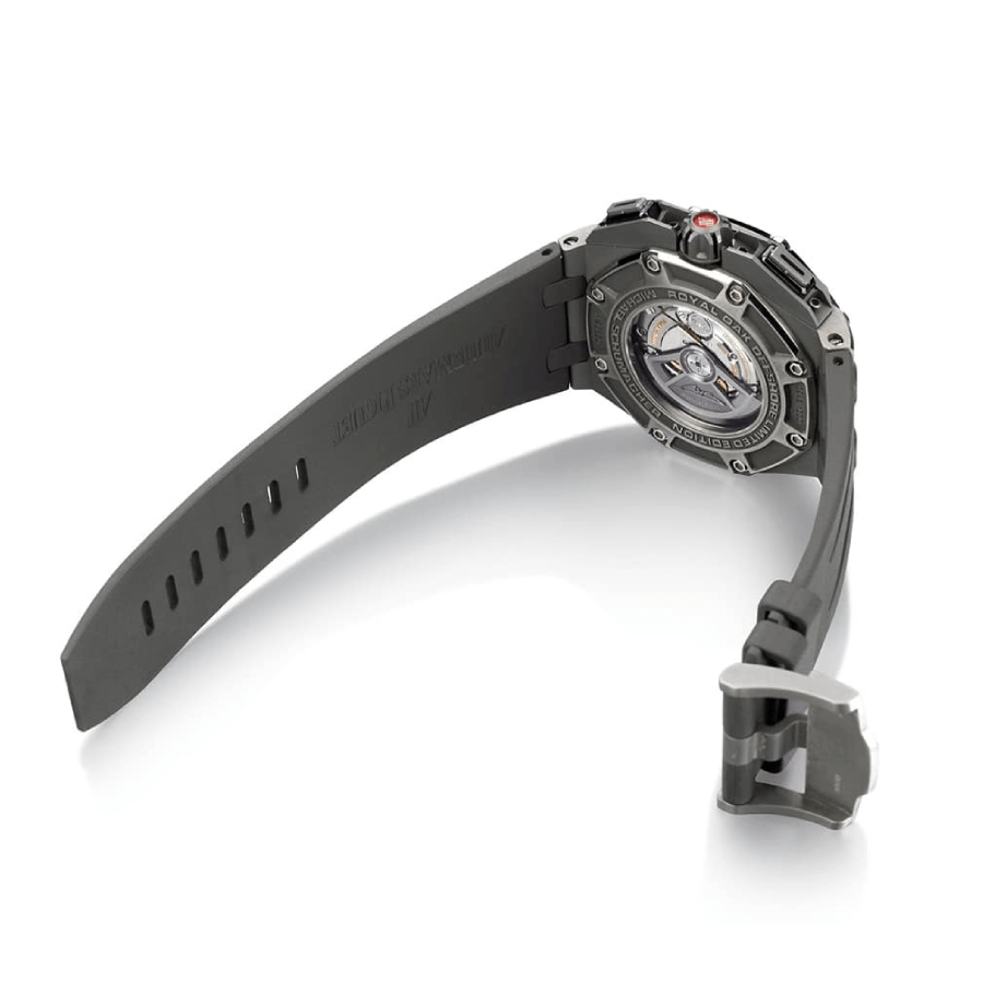 The Audemars Piguet Royal Oak Offshore 26568IM.OO.A004CA.01 is a luxury replica watch. It features a 904L stainless steel case and bezel. with a sapphire crystal and a 44.00 mm size and 14.25 mm thickness. The grey rubber bracelet is adjustable and features a 904L stainless steel fold clasp. The grey dial has stick indices and stick hands. both made of 904L stainless steel.
